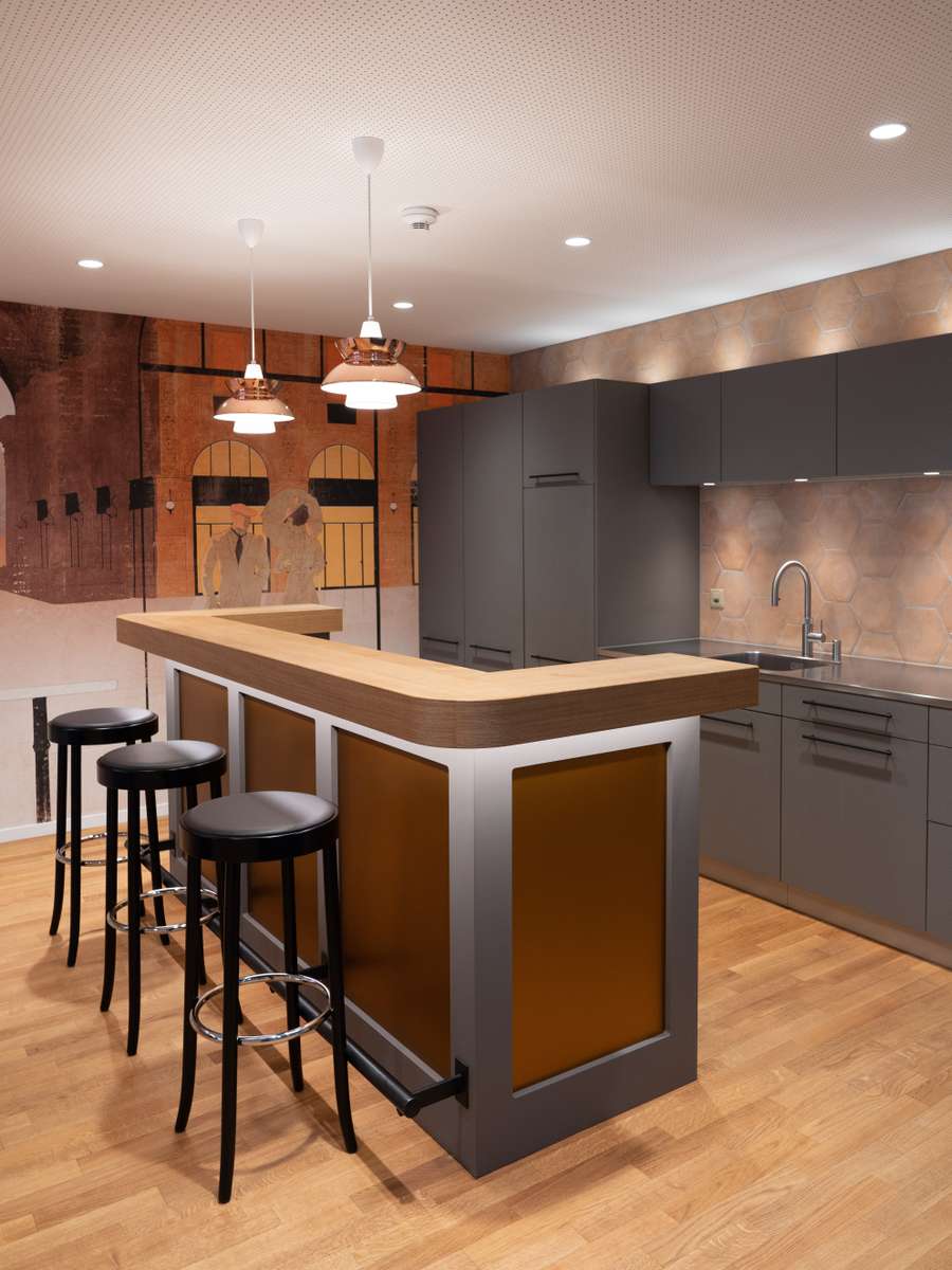 Die Cafeteria orientiert sich am Stil eines Kaffeehauses aus den 1920er Jahren. Es wurden bewusst langlebige Massivholztische und robuste Stühle ausgewählt. Einige der Möbel werden heute noch nach den Entwürfen dieser Epoche gefertigt, während moderne Leuchten und Loungemöbel, die zum Stil passen, dazu kombiniert wurden.