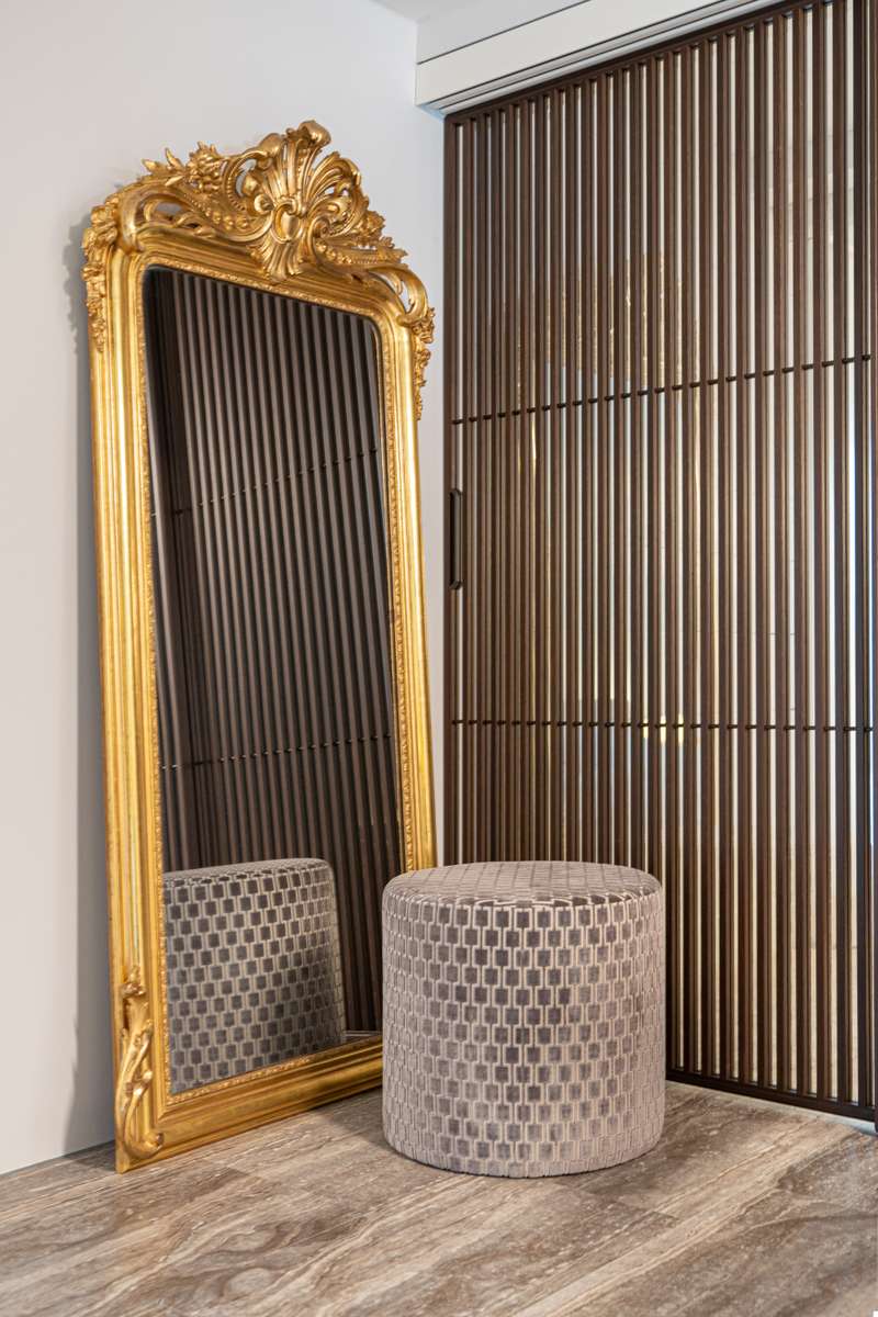 Im TV-Zimmer im Obergeschoss bietet eine grosszügige Sitzgruppe Platz zum Ausruhen. Auch die Schlafzimmer wurden komplett neu ausgestattet, wobei alle Details sorgfältig aufeinander abgestimmt sind. Beispielsweise greift das Kopfteil des Bettes das gleiche Muster wie die Schiebetüren zum Bad auf. Der Pouf wurde in unserem Polsteratelier gefertigt und passt perfekt zur übrigen Ausstattung.